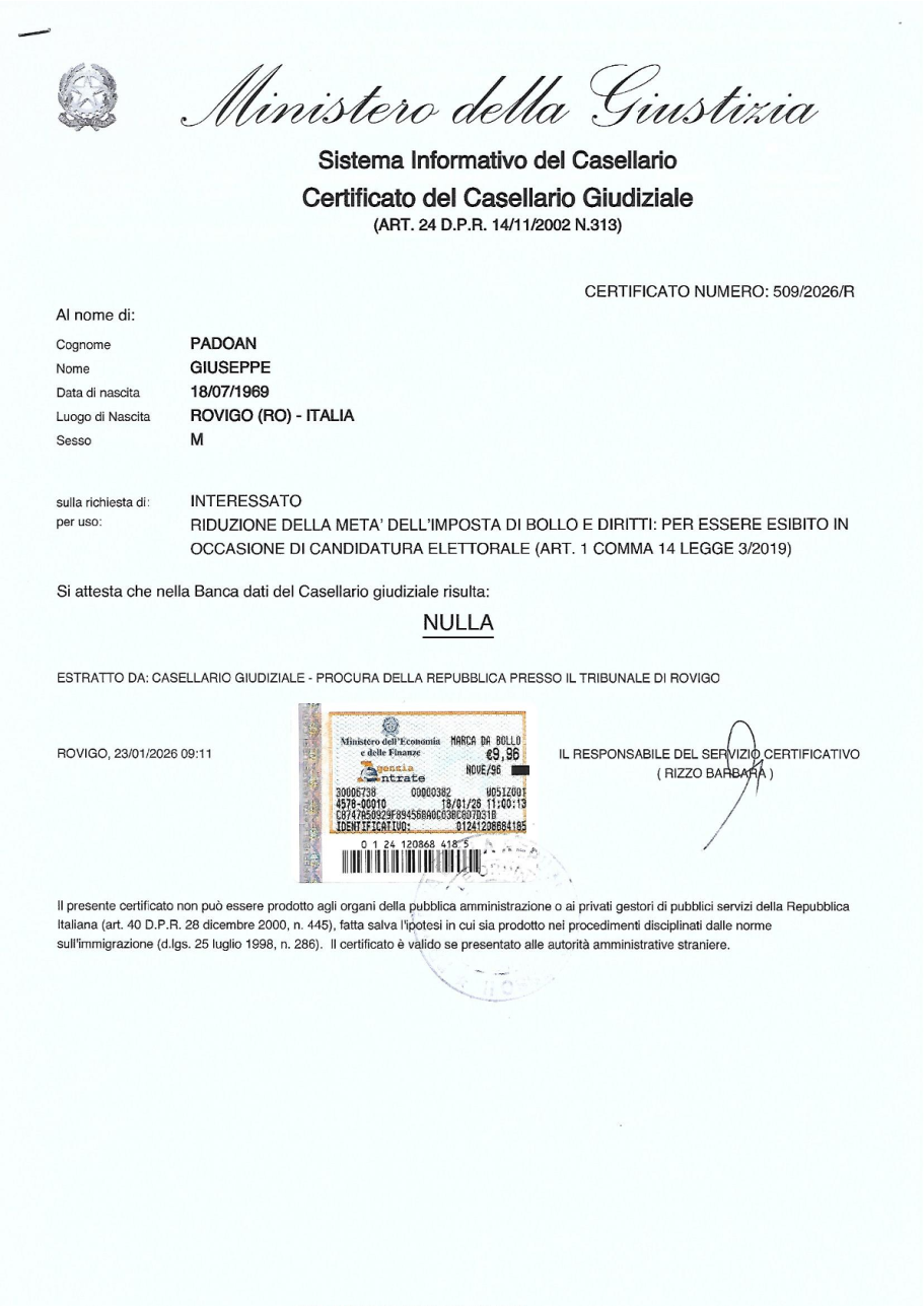 e il Certificato del Casellario Giudiziale del Candidato e a breve le nostre proposte e la rendicontazione delle entrate e delle uscite