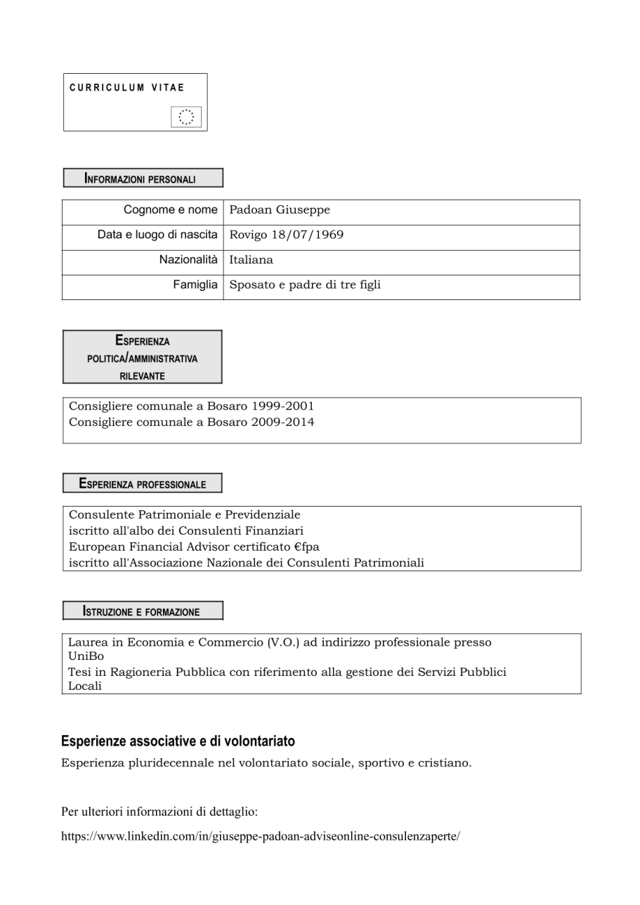 Ai sensi della Legge 3/2019 art. 1, comma 14, pubblichiamo il Curriculum Vitae
